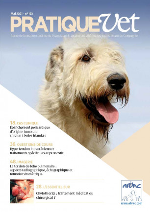 La torsion de lobe pulmonaire est une affection rare chez le Chien et le Chat. Les signes cliniques sont variés et non spécifiques, ce qui fait de l’imagerie médicale une étape essentielle au diagnostic. Après la stabilisation du patient, la prise en charge est chirurgicale et consiste en une lobectomie du lobe pulmonaire tordu.